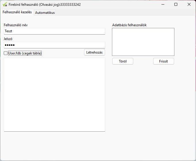 A főmenüben a Szerviz menü | Adatbázis felhasználó létrehozása menüpont alatt tudjuk ezen felhasználókat rögzíteni.