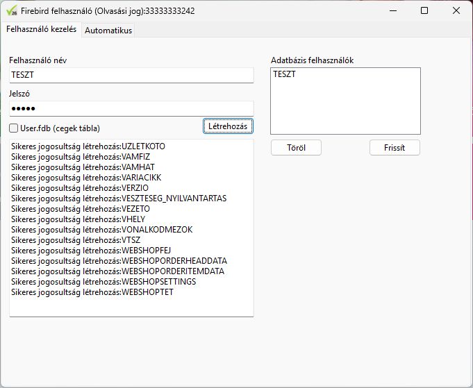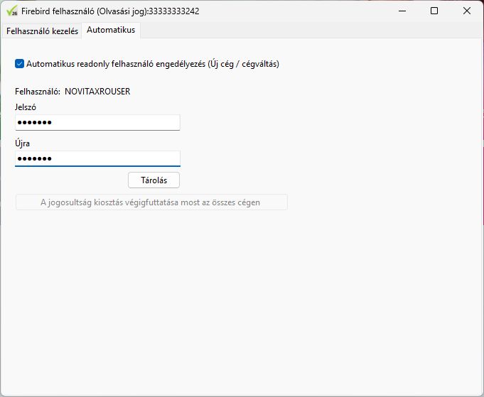 Amennyiben nem akarunk cégenként létrehozni felhasználót, akkor az Automatikus fül alatt egy gombnyomással létre tudunk hozni egy NOVITAXROUSER felhasználót, amely minden aktuálisan betöltött cégre, és új cég esetén érvényes lesz.