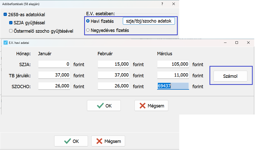 A havonta megadott összegekkel készül el a havi adóbefizetések lista. A negyedév végén lehetőség van a Számol gombbal a különbözet megállapítására, amely összegek a negyedév végén készített adóbefizetések listára kerülnek.