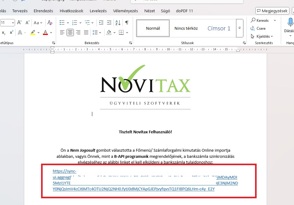 A kapott dokumentumban lévő link EGYEDI, ezért ahány felhasználó, annyiszor kell a Nem jogosult gombbal kezdeményezni a dokumentum létrehozást, így minden esetben egyedi link keletkezik meg! Egy linkről csak egy felhasználónak szabad szinkronizációt kezdeményezni!
