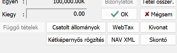 A “Biz. csat. állomány szerk.” gombbal itt is a fejcsatolást érjük el, de a “Tételhez csatolt áll. szerkesztés” gombbal a bizonylattételhez történő csatolás lehetséges.