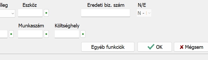 A bizonylat tételek rögzítésekor az “Egyéb funkciók” gombbal elérhető lehetőségek között szintén megtalálható a bizonylatfej-szintű csatolás lehetősége, de itt a bizonylattételhez történő csatolás is lehetséges.