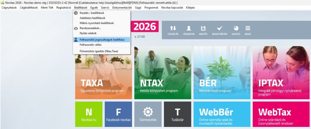 A funkció a programrendszer főmenüjében a Beállítások / Felhasználói jogosultságok beállítása menüpontban található. Ezen a helyen a felhasználók és adminisztrátorok rögzítését és a funkcionális jogosultság beállításait lehet megtenni. Továbbá lehetőség van a modulokban a menüpontokat is ki- és bekapcsolni vagy aktívvá és inaktívvá tenni. Ezek a funkciók a modulokban találhatók, a hollétükről lejjebb található információ.