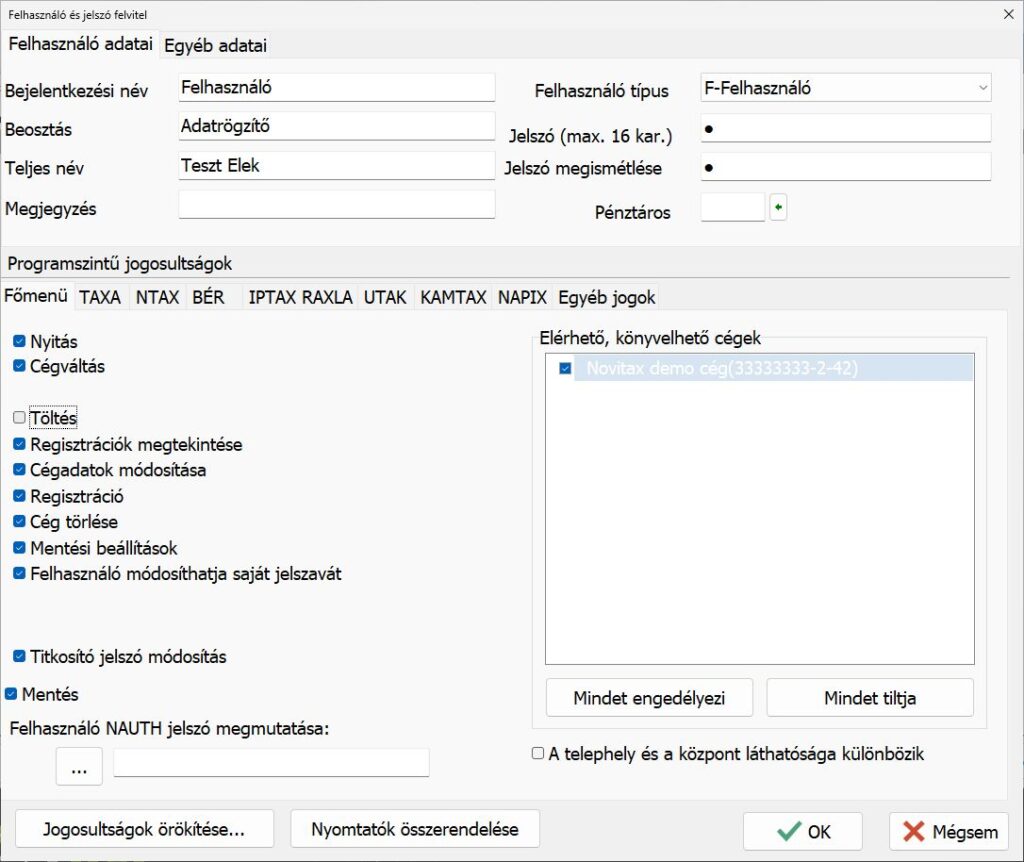 A kiválasztott cégeket érheti el a felhasználó. Amenniyben új cég keletkezik vagy betölotődik az az adott felhasználóra nincs engedélyezve, ezt a lépést az adminisztrátornak kell megtennie.