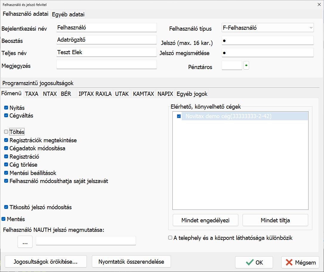 Felhasználókat és Andminisztrátorokat állíthat be és megadhatja, hogy ki melyik céget és azon belül milyen műveleteket és menüpontokat kezelhet.