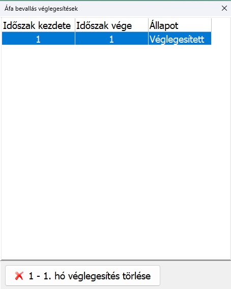 Az áfa bevallások véglegesítésének módja nem változott, de a menüpontban most már nyomon követhető, hogy mely időszakokra történt véglegesítés, illetve ebben a menüpontban visszatörölhetők az eddigi véglegesített időszakok is, de csak időrendben visszafelé. A menüpont elérhető: Kimutatások>Áfa>Elektronikus bevallások>Áfa bevallás véglegesítése