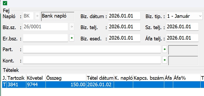 A tétel rögzítésbe kikerült a Tétel dátum – ez a dátum csak bank típusú napló esetében tartalmaz adatot.