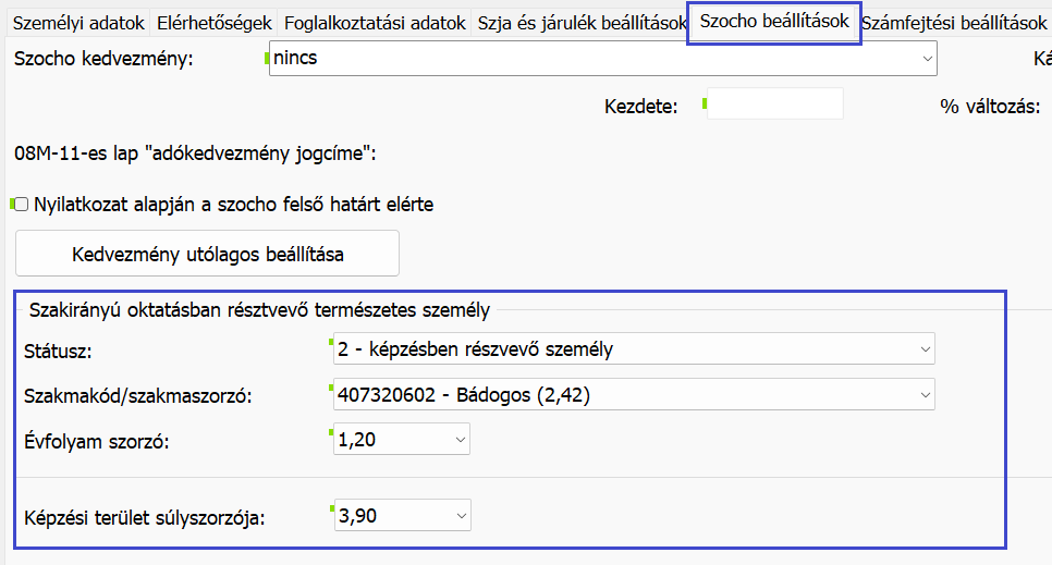 A Személyi adatokban, a szakirányú oktatás és duális képzés szocho kedvezményének érvényesítéséhez és a 08 adatszolgáltatásba való helyes szerepeltetéséhez, a Szocho beállítások fülön megadhatók az alábbi paraméterek: