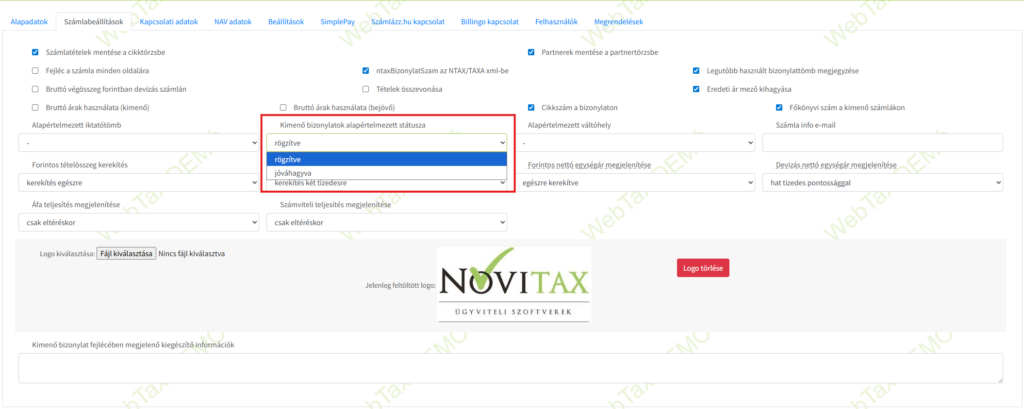Lehetősége van alapértelmezettnek beállítani, hogy az elkészült kimenő számla; rögzítve, jóváhagyva állapotot adjon meg.