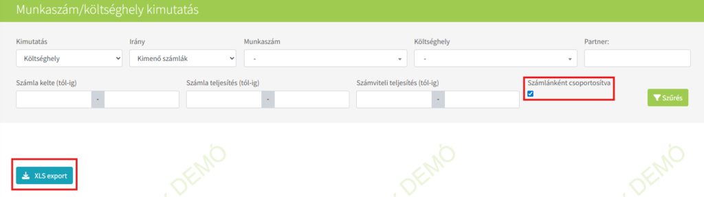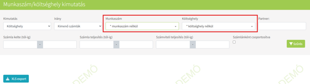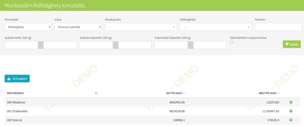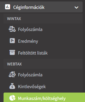 Ebben a menüben lehetőséget adunk arra, hogy a WebTax-ban a kimenő és bejövő bizonylatok kontírozásánál megadott munkaszámról és költséghelyről különböző szűrésekkel kimutatást tudjon készíteni.