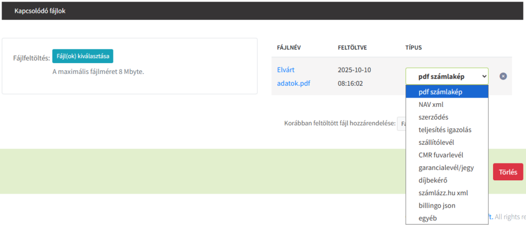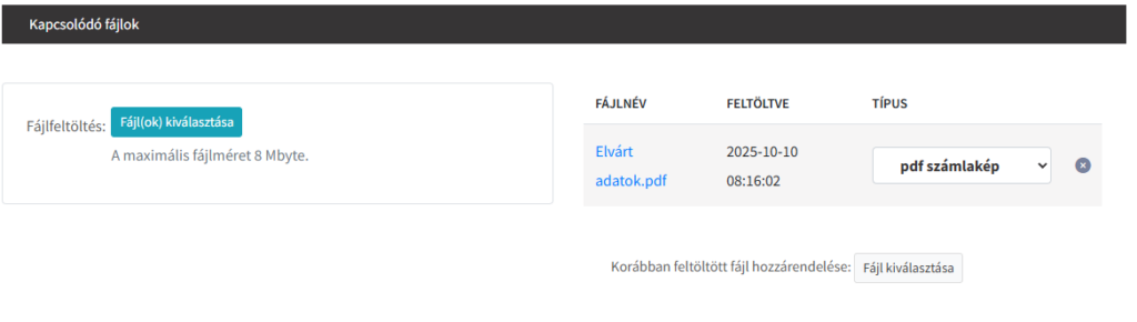 A Korábban feltöltött fájl hozzárendelése kiválasztása esetén a WebTax Fájlok, dokumentumok menüben feltöltésre került dokumentumokból lehetséges fájlt kiválasztani/kapcsolni.