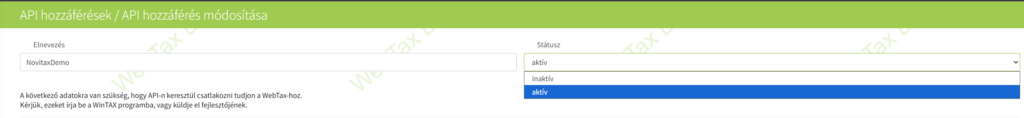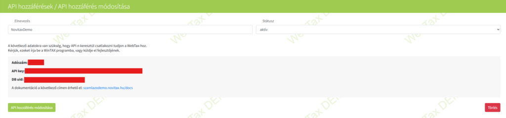 Az aktív API hozzáférést fel lehet függeszteni, ha a Státuszt inaktív állapotba helyezi. Az inaktív/aktív állapotot bármikor változtatni tudja. Az adatok módosíthatóak a módosítás funkció megnyomásával. Törlés gombbal a hozzáférési lehetőség teljesen megszűnik.