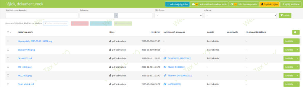 Számlaképek feltöltése funkcióban a Fájlok, dokumentumok/ fájl feltöltés opció kapott helyet aminek a funkcióit egy előző cikkünk elején részleteztük, ezen a linken megtekinthető.