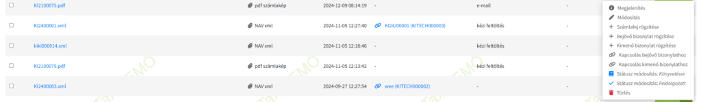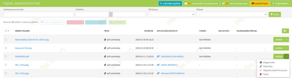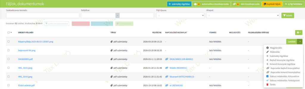 A feltöltött dokumentum rögzítését és a hozzájuk tartozó különböző funkciók használatát a bizonylat melletti, zöld Letöltés ikon jobb oldalán található lefelé mutató nyíl lenyitása után teheti meg.